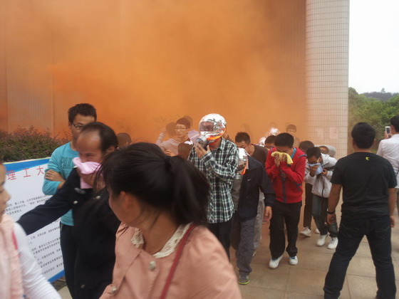 3:45,在活动现场指挥伍接朝副处长和王煜坤副处长下达“应急疏散逃生演练现在开始”的指令后,保卫人员和辅导员老师迅速有序的组织学生撤离到安全地带,同时在礼堂出口处燃放烟幕弹,一些同学带上了防毒面具,或用毛巾、衣物等捂住口鼻,按照正确的动作要领从烟幕中穿过,迅速撤离到礼堂外面的广场上。消防专家还指导了学生如何正确使用灭火器,对火堆进行现场灭火演练。