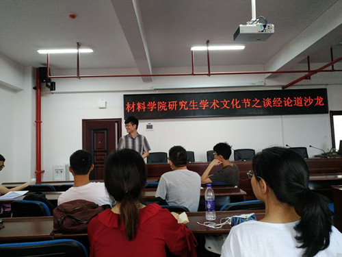 5月18日,材料学院于新能源大楼302室举办研究生学术文化节系列活动之“谈经论道沙龙”。本次活动由18届优秀研究生毕业生张健、姚琦、黄国游主讲,全体研究生及部分本科生参加,研究生辅导员陈鑫林出席。