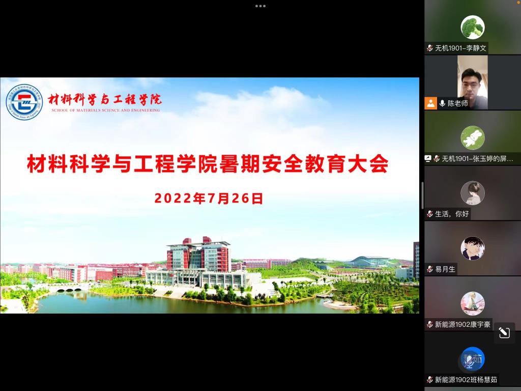 为进一步强化暑期学生安全防范意识,材料学院于7月26日-27日分年级分批次开展安全教育线上会议,全体辅导员出席会议,全体学生参加。