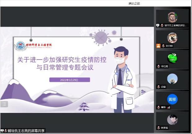 329日晚上20时,材料学院召开了关于进一步加强研究生疫情防控与日常管理培养线上专题会议,本次会议由研究生辅导员王志亮主持,院总支部副书记陈华副院长杨现锋出席,全体研究生参加。