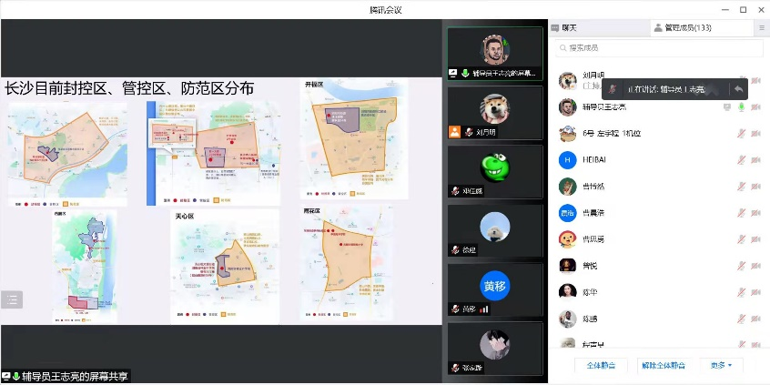 王志亮首先就目前疫情形势以及长沙本地疫情实时数据和确诊病例详情进行了详细介绍,传达了学校关于疫情防控的有关要求,告诫同学们非必要不要外出,尽量不要网购和点外卖,就餐尽量从食堂打包带回寝室吃,保持寝室卫生,每天按时进行钉钉健康打卡严格遵守疫情防控规定