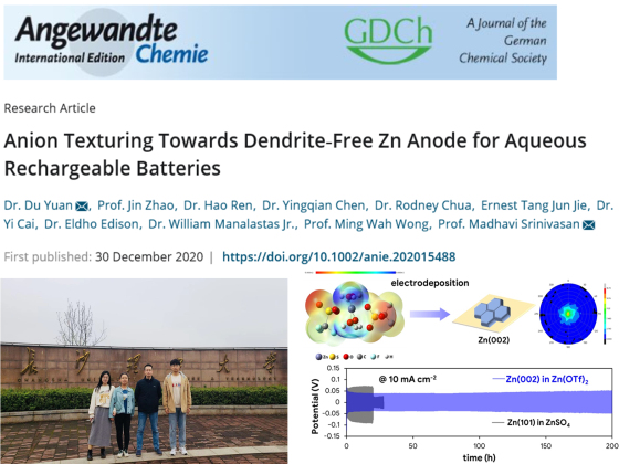 近日,taptap点点湖南省团队百人计划核心成员、湖湘学者、taptap点点体育材料学院袁度博士与合作者们在化学领域国际权威期刊德国应用化学(Angewandte Chemie)上以taptap点点体育为第一单位发表研究工作“AnionTexturingTowardsDendrite-FreeZnAnodeforAqueousRechargeable