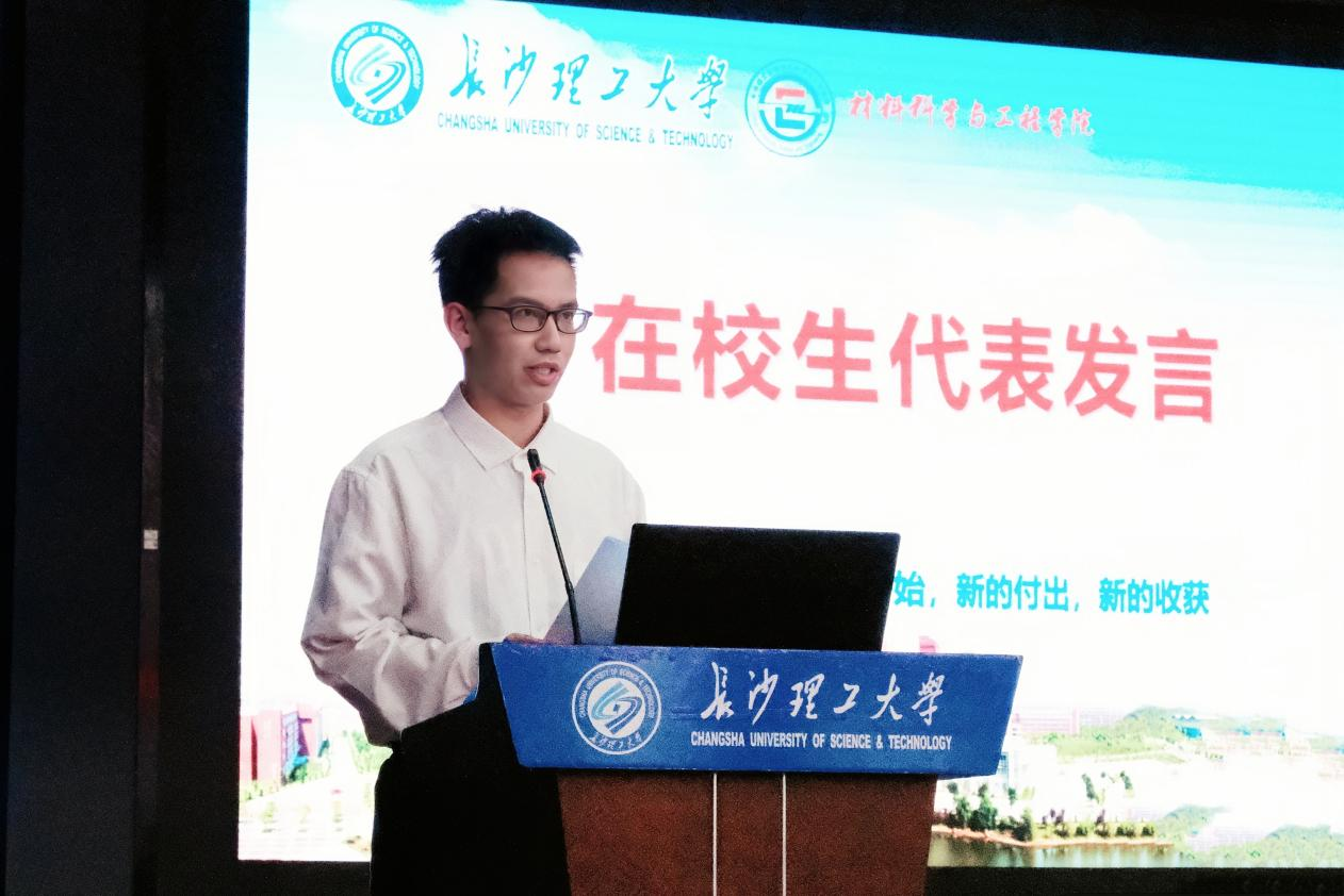 无机非金属材料系张龙老师作教师代表发言,他从自己的心路历程出发,希望同学们要在大学期间树立远大理想,勇于担当使命,将个人理想融入国家发展大局;敢想敢为,善做善成,不断培养我们的服务意识和协调能力;勤奋学习,扎实基础,并勇于突破创新,为材料科学的进步贡献自己的智慧和力量;注重集体,学会沟通与合作,与他人一起创造更加辉煌的成就;加强社会实践,提升就业竞争力,在未来紧张的就业市场里抢占先机。