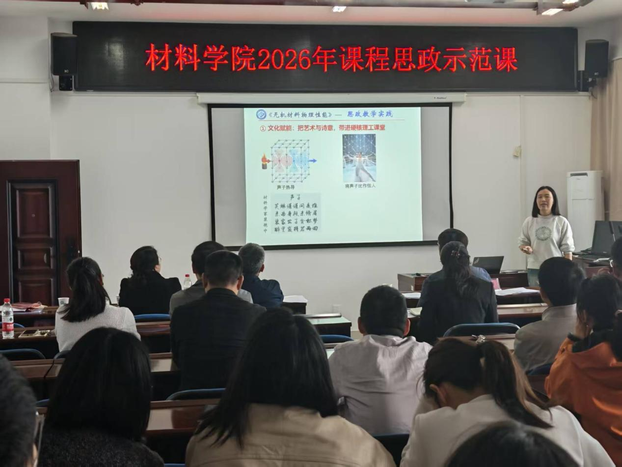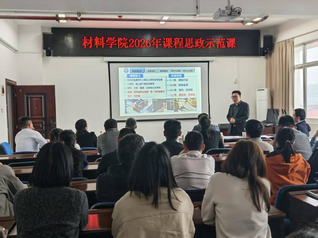 为深入贯彻立德树人根本任务,推动价值塑造、知识传授、能力培养三位一体深度融合,全面提升课程思政建设质量与育人水平,4 月7日下午,材料学院在新能源大楼1-908会议室举办2026年课程思政示范课说课展示活动。学院党政领导班子、全体专任教师共同参加观摩交流。