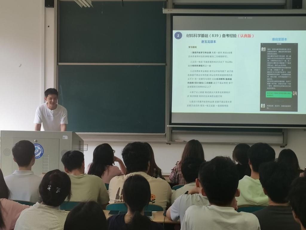 4月23日下午,材料科学与工程学院本科学生党支部于工科三号楼B211开展“理想启航,研梦飞扬”主题党日活动分享考研学习经验。本次活动由本科一支部和二支部联合举办,共60余名低年级党员和入党积极分子参加。党员何艺璇主持了本次活动。