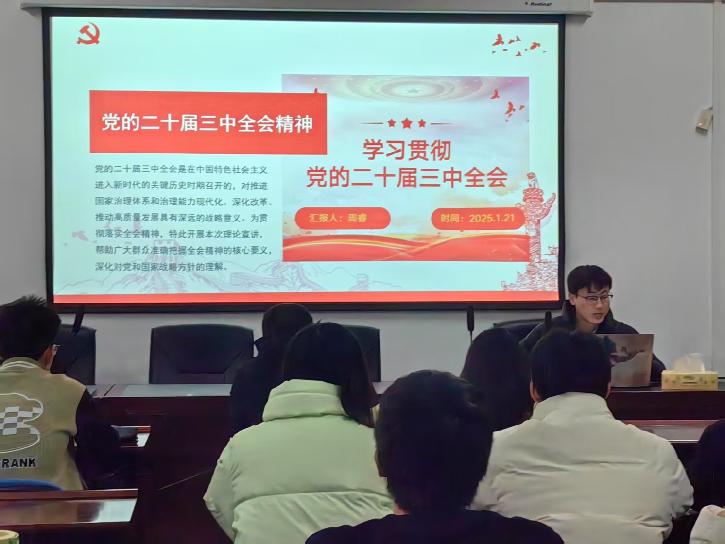 在本次会议中,晏劲松组以“沁润传统文化,焕发民族自信”为主题,展示了传统文化调研与红色精神融合的实践成果;郭雅琴组通过“红色传承——参观毛泽东与第一师范纪念馆”的生动讲述,再现革命先辈的奋斗历程;杨静怡组通过参观中国共产党长沙历史馆的见闻,感悟党的光辉历程;周睿组结合党的二十届三中全会精神宣讲,探讨青年党员如何立足专业服务社会。