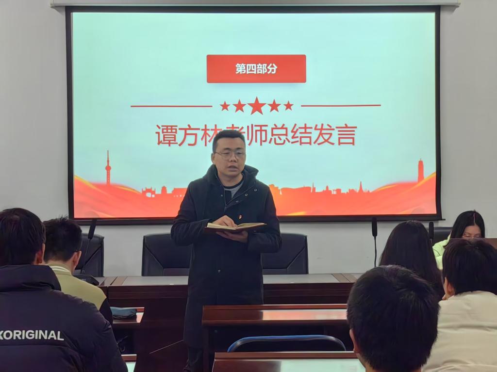 会议最后,党建辅导员谭方林老师作总结发言。他充分肯定了各小组在实践中展现的担当与创造力,他希望学生党员们能够继续深入学习党的理论知识,将所学所得应用到实际生活中,持续提升个人的综合素养和对社会责任的担当。将理论知识与实际操作相结合,实现知行合一,以具体的行动展现先锋模范的风范。