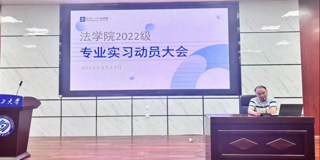为进一步提高学生法务实践能力,保障学生专业实习顺利进行,5月27日下午,法学院在金盆岭校区四教学术报告厅召开2022级本科生专业实习动员大会。院党委书记龚文斌、副书记汪伦和副院长徐莉出席会议,实习指导教师阳明武、宁佳、李姝,辅导员孙佳乐老师和全体2022级本科生参会,会议由涉外法治系副主任贾佳主持。