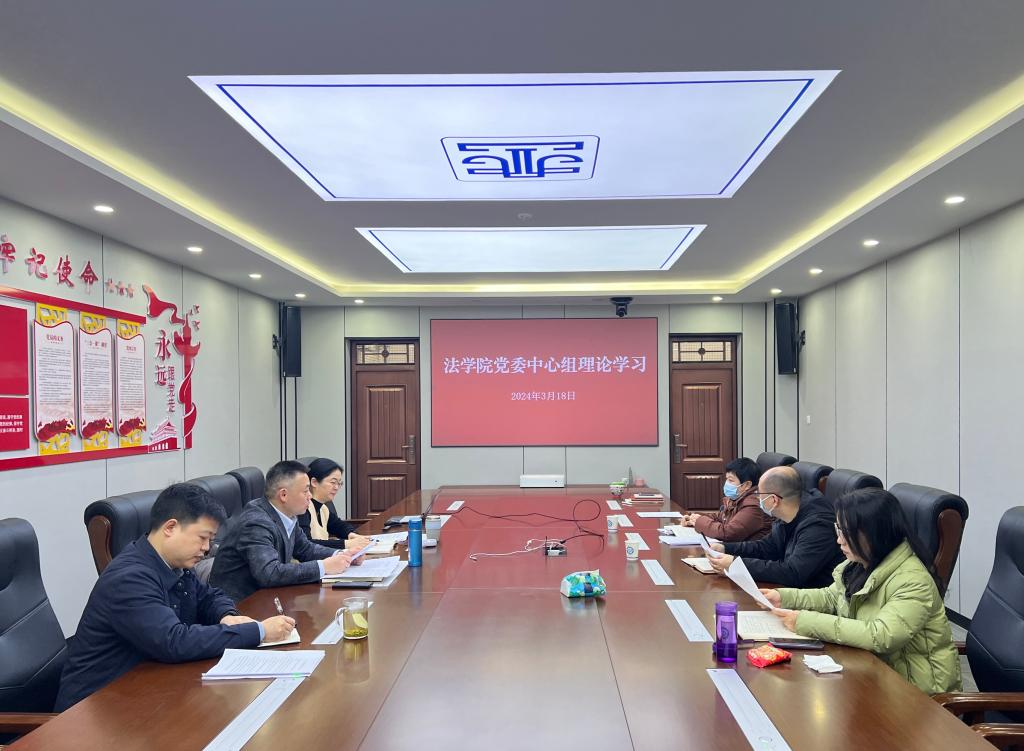 3月18日上午,法学院党委理论学习中心组在金盆岭校区四教学楼313会议室组织集中学习,传达学习习近平总书记在全国两会期间的重要讲话精神、十四届全国人大二次会议和全国政协十四届二次会议精神,学习《2024年政府工作报告》。院党委书记龚文斌主持会议并领学讲话,院党委理论学习中心组成员参加会议。