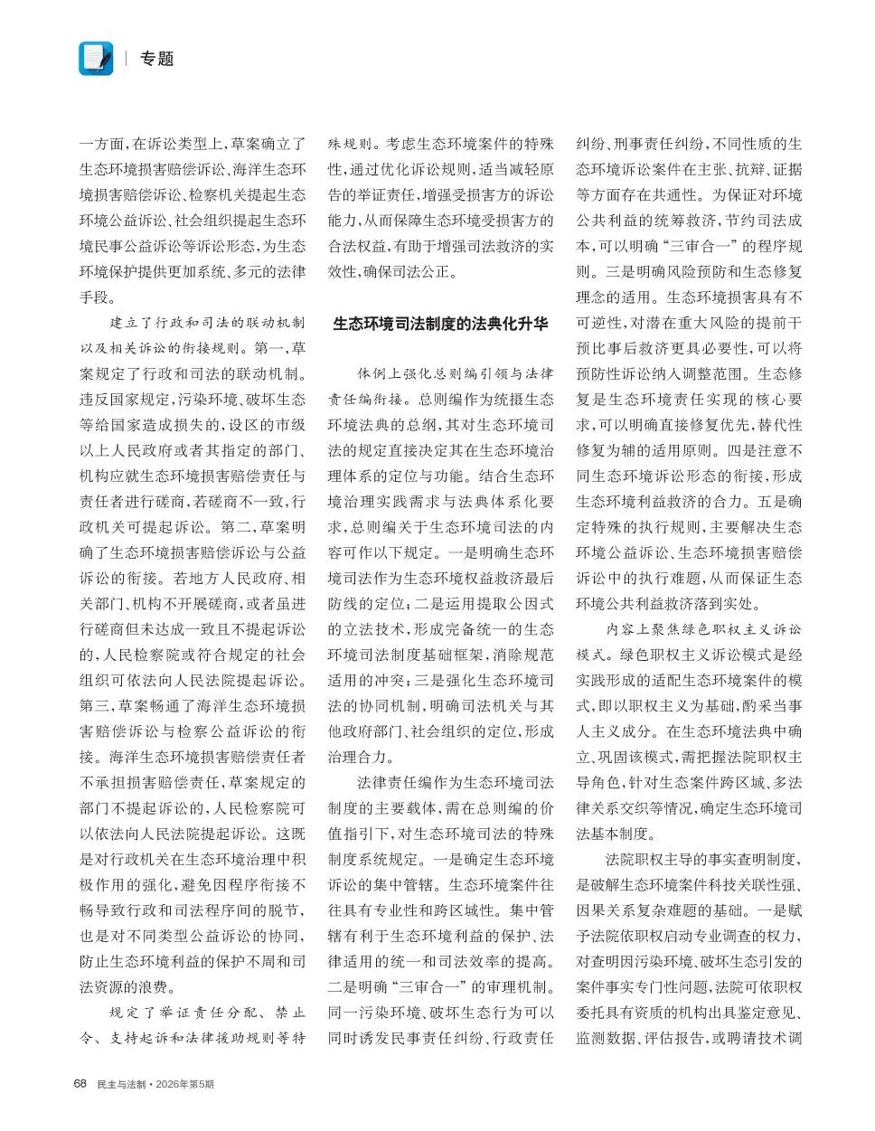 文章介绍了生态环境法典草案的探索,提出法典化升华的路径:在体例上强化总则编引领与法律责任编衔接,明确司法定位、构建统一制度框架;在内容上聚焦绿色职权主义诉讼模式,构建法院主导的事实查明制度,完善生态修复执行机制与不同诉讼衔接规则,最终实现生态环境权益的充分保障。