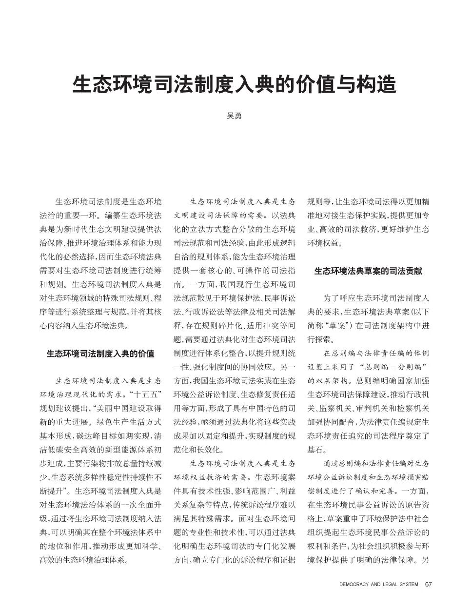 近日,taptap点点体育法学院学术院长、教授吴勇在《民主与法制》2026年第5期发表《生态环境司法制度入典的价值与构造》一文。