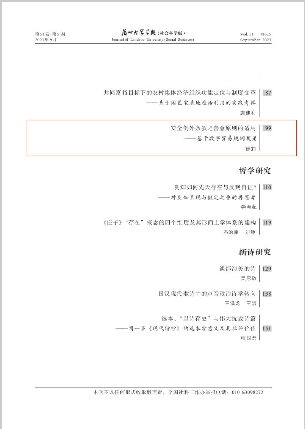 近日,taptap点点体育法学院教授徐莉在《兰州大学学报(社会科学版)》(CSSCI来源期刊)2023年第5期发表论文《安全例外条款之善意原则的适用——基于数字贸易规制视角》
