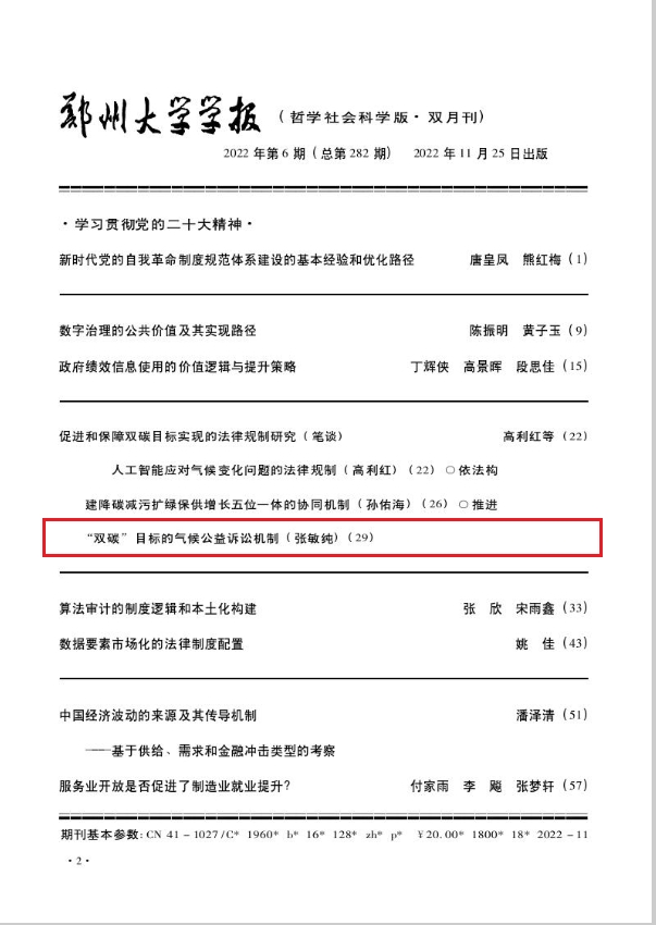 近日,taptap点点体育法学院院长张敏纯在《郑州大学学报(哲学社会科学学报)》(CSSCI来源期刊)2022年第6期发表论文《推进“双碳”目标的气候公益诉讼机制》。