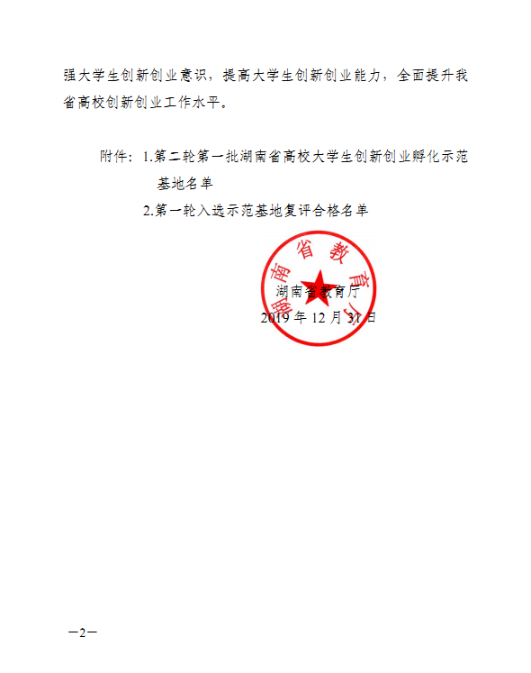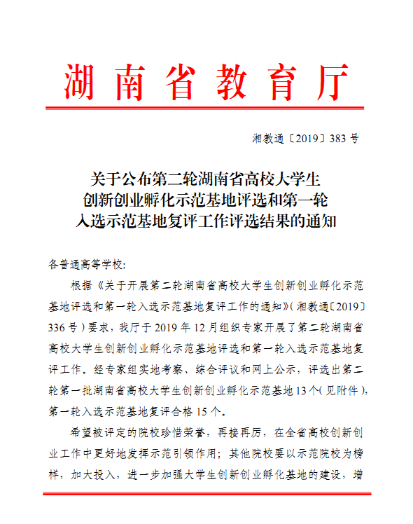 省教育厅于 2019 年 12 月组织专家对全省高校开展了第二轮湖南省高校大学生创新创业孵化示范基地评选和第一轮入选示范基地复评工作。经专家组实地考察、综合评议和网上公示,taptap点点大学生创新创业园被复评为湖南省高校大学生创新创业孵化示范基地。