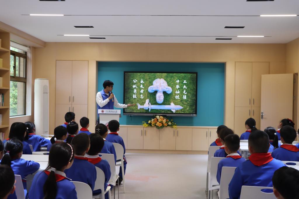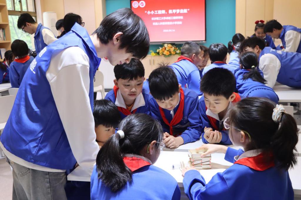 签约仪式后,一场别开生面的“科普思政课”随即展开。来自卓越工程师学院的学生志愿者们带领小学生们分组开展科学小实验——悬浮剑、液压升降机、磁吸小车……一个个趣味实验激发了孩子们的浓厚兴趣。在动手操作的过程中,大学生们不仅深入浅出地讲解科学原理,更将钱学森、邓稼先等红色工程师“严谨治学、矢志报国”的故事融入其中,让科学精神与爱国情怀在孩子们心中悄然生长。