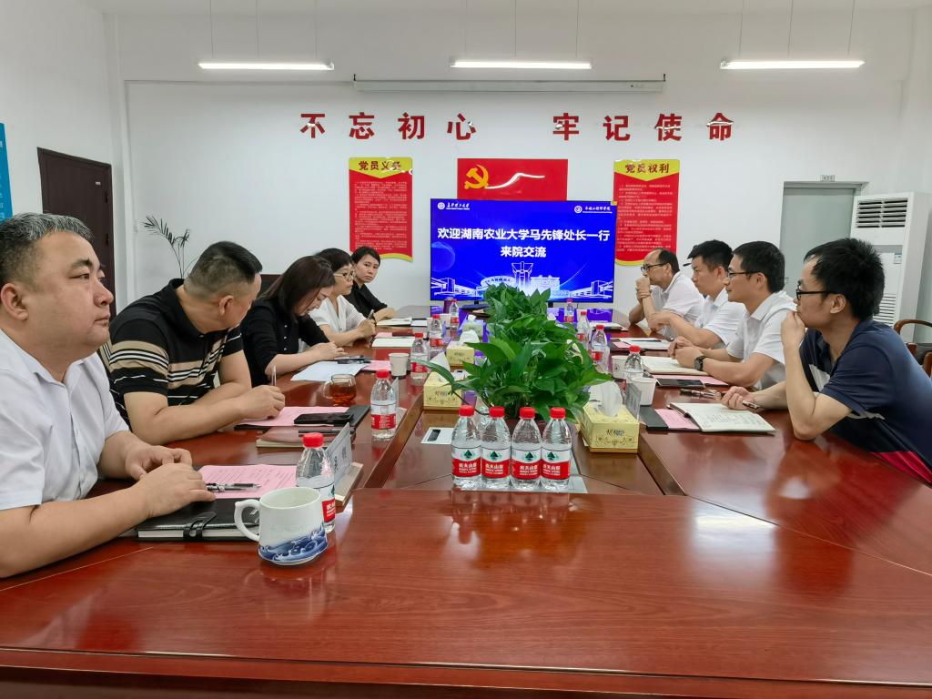 6月27日上午,湖南农业大学教务处处长马先锋、交叉学科研究院院长周智、教务处副处长徐锋、刘添柱一行4人来院交流座谈。学院院长韩艳、党委书记杨晨、副书记兼副院长陈华、副院长向永生、吴钢参加交流座谈会。会议由韩艳主持。