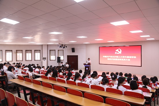 校党委委员、副校长蒋璟萍,党委组织部副部长靳攀科,外国语学院老领导郑延国、陈建生、覃先美、李冀宏、熊丽君受邀出席大会,外国语学院各师生党支部共计87名党员参加大会,大会由外国语学院院长段胜峰主持。