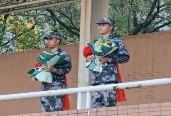 仪式上,邱国良和喻玲为入伍学生代表佩戴大红花并赠送礼物。