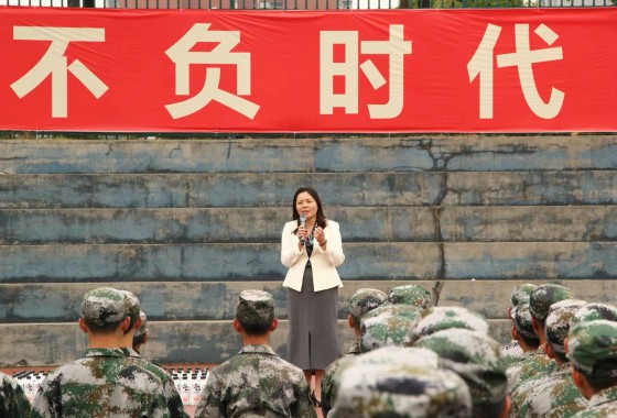 来到操场,学院领导带领23级辅导员与军训教官进行亲切的交流,了解了军训训练安排和学生训练的进展情况。随后,丁丹与学生亲切交流,充分肯定了新生们在训练中所表现出来的吃苦耐劳精神,为同学们深入解读了“王牌电气,勇攀高峰”这一口号的来历,并对他们提出两点希望:一是勉励同学们认真对待军训第一课,通过军训更好的融入电气学院这个大家庭,并借此机会磨炼自己意志,增强团结协作精神和集体荣誉感;二是希望同学们培养坚持不懈、迎难而上的精神,以更加积极饱满的状态投入到新学期的学习生活中,在大学期间争取新的更大的进步,实现自己的理想与抱负,不负青春韶华。