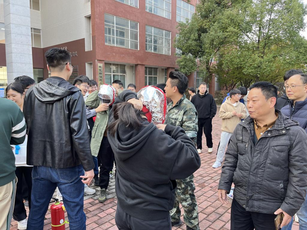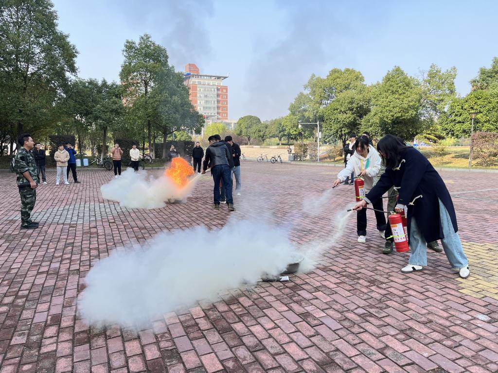 “消防防毒面具在使用前,请大家确保密封未破坏再进行使用……”,在工一东侧前坪,易国安、梁继超对同学们的逃生演练情况进行了点评,并对火灾逃生要点进行了讲解,随后对消防防毒面具、干粉灭火器的使用方法进行了说明,同学们积极学习和尝试佩戴消防防毒面具。随着火堆被点燃,同学们开始灭火实践演练,在实践中巩固技能,熟练掌握了灭火器具使用方法。