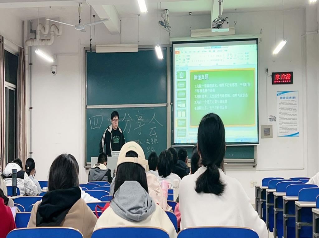 本次会议分为三个部分。首先由彭稳学长传授四级经验,他着重强调了背单词以及刷题的重要性,为各位同学提供了很多学习方法,接着,毛宇航学长结合自身经验以及对大一新生的了解,以ppt的形式从英语学习的逻辑,四级学习的逻辑,四级到六级的进化和以赛促学四个方面向各位同学传授相关经验。最后,两位学长和各位同学以问答的形式为大家答疑解惑。在本次分享会后,大一的同学们对四级有了更深的认识,也学会了更多的英语学习经验。