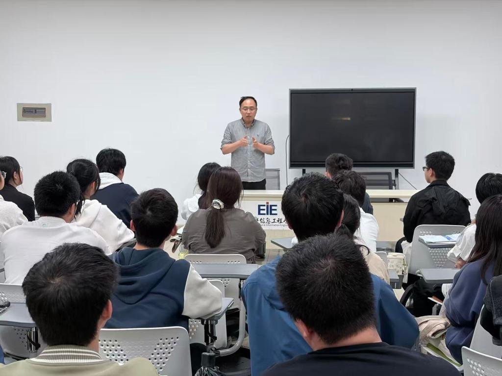 会议伊始,辅导员朱杰与同学们分享学习心得。无论选择考研或就业,扎实的学业基础和丰富的竞赛经历都至关重要。他希望同学们珍惜“电创班”这一平台优势,积极利用学院提供的优质导师资源,并注重在课堂内外展现班级积极向上的整体风貌,共同维护班级集体荣誉。