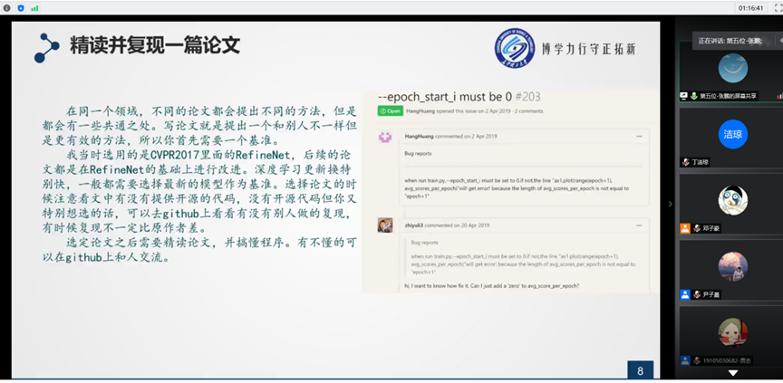 张鹏结合自身经历谈到,写论文前期要确定并了解研究方向,精读并复现他人论文,设计并展开实验,在积累了此研究方向的大量知识后,坚持下去一定能有成果。他建议论文要丰富实验分析,突出自身方法的优势,把握整体逻辑性,遇到困难要积极寻找解决途径。
