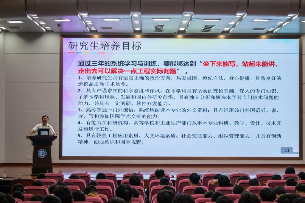 短暂休息后,曾祥君教授为2023级全体新生讲授开学第一课。他从党的二十大锚定的战略目标和使命任务和第四轮科技革命为背景,详细解读科技、教育、人才对于社会主义现代化强国建设的重大意义,阐明研究生的时代责任与历史使命。希望同学们胸怀大情怀、勤学慎思,努力提升理论知识和科研水平,做到“坐下来能写,站起来能讲,走出去可以解决一点工程实际问题”,且具备良好到的道德品质和学术修养,将自己真正培养成“底色亮、实践强、善创新、敢担当”的人才。随后,他详细介绍了学院各学科研究方向、教育培养管理机制、奖、助学金制度、论文写作、文献检索等方法。