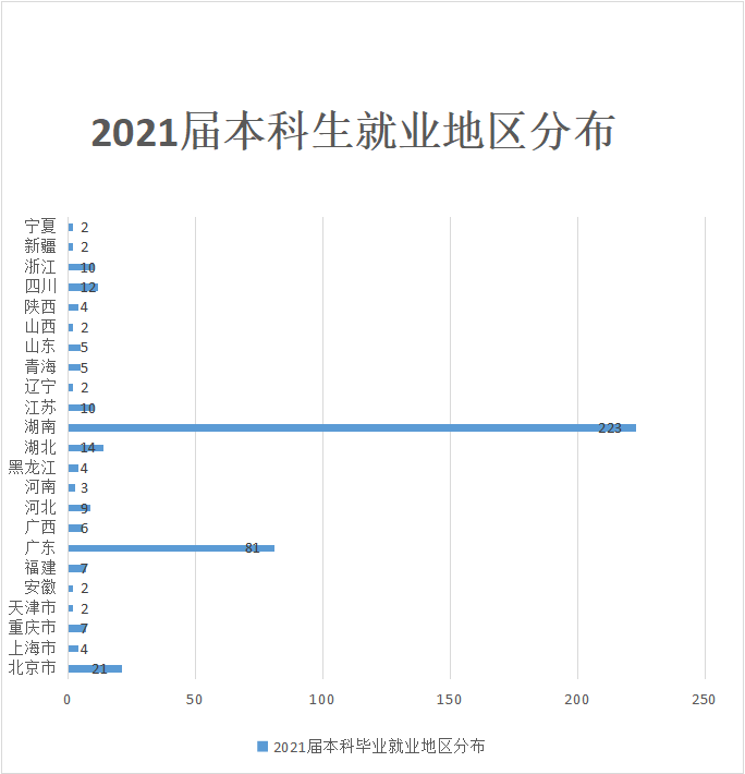 在2021届本科生就业443人中,湖南生源共280人,湖南生源省内就业的有219人,占78.21%;就业于两广地区(广东、广西)的有37人,占13.21%;就业于全国其他地区的有24人,占8.57%。除湖南生源的163人中,选择在生源地就业的有116人,占71.17%