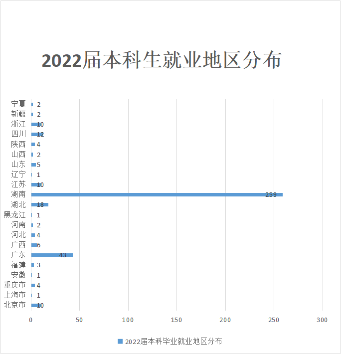 在2022届本科生就业704人中,湖南生源共467人,湖南生源省内就业的有259人,占55.46%;就业于两广地区(广东、广西)的有50人,占10.71%;就业于全国其他地区的有158人,占33.87%。