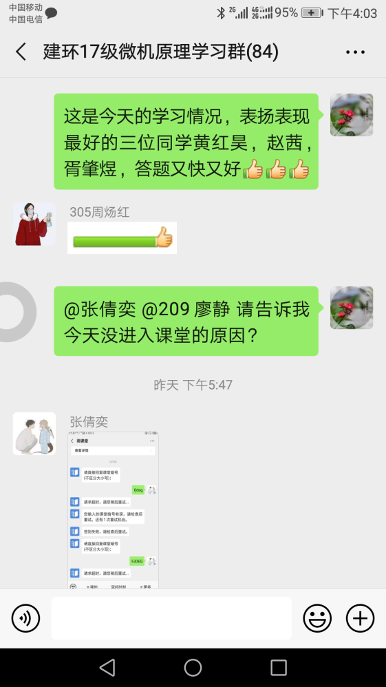 雷辉老师主讲的《微机原理及应用》课程是信息类、电气类、机电类等非计算机专业的一门重要基础课程,内容丰富,概念抽象,软硬件结合,学习难度大。她考虑到学生没有教材,就在课前将教材按章节每页拍下来,提前发给学生预习,并提前将课件、讲义和拓展资料上传到网络教学平台,供学生对照自学。直播课堂上,她通过组织限时答题、随时抽取学生答题和派发红包等方式将学生牢牢吸引在课堂上。课后,她通过课程微信群督促学生按时完成作业,在线答疑,并通过电话与缺课学生谈心。“当教师不是为了名利,而是为了育人,做这些都是教师的本分!”雷老师说。