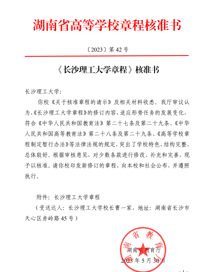 新修订的《大学章程》深入贯彻党的十八大以来党和国家关于高等教育的新思想、新提法、新部署,尤其是党的二十大报告中关于教育工作的重要战略部署,同时全面融入湖南省第十二次党代会精神和学校第四次党代会明确提出的发展思路与目标任务,进一步凝练学校办学特色、明确改革方向,完善自我监督机制,体现出更具长理特色、更高水准的鲜明导向,切实为引领促进学校内涵式、高质量发展提供了制度保障。