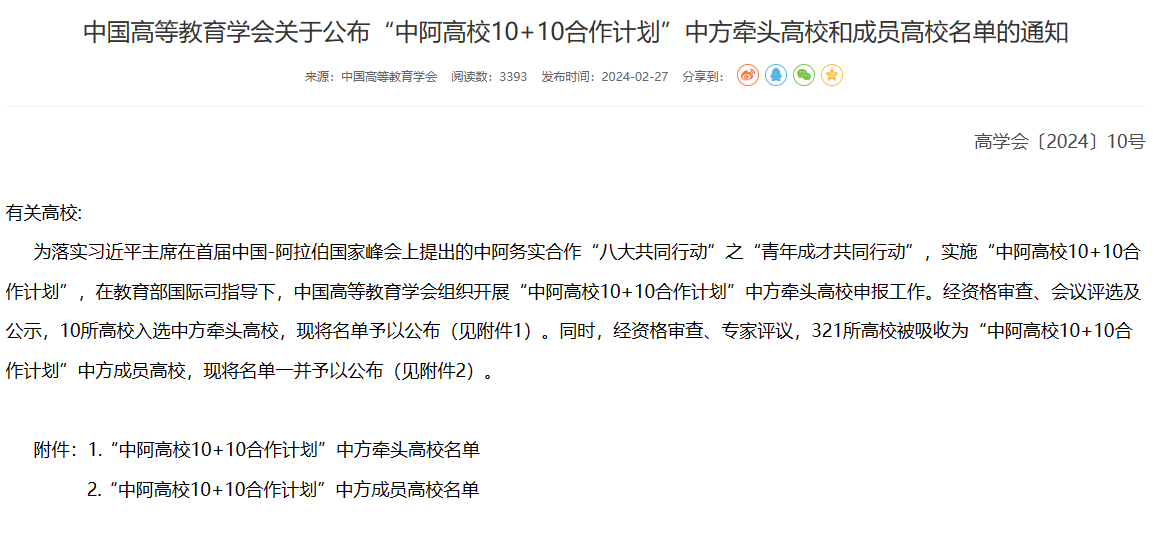 “中阿高校10+10合作计划”是为落实习近平主席在首届中国-阿拉伯国家峰会上提出的中阿务实合作“八大共同行动”之“青年成才共同行动”而启动的计划。在教育部国际司指导下,由中国高等教育学会与阿拉伯大学协会共建“中阿大学联盟”交流机制,实施“中阿高校10+10合作计划”,为中阿高校搭建校际交流合作平台,推动中阿高等教育共同发展。