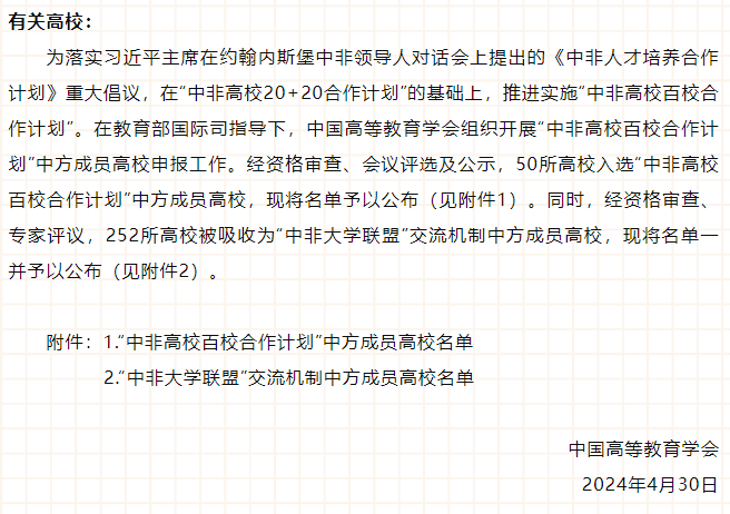 “中非大学联盟”交流机制是为落实习近平主席在约翰内斯堡中非领导人对话会上提出的《中非人才培养合作计划》重大倡议而搭建的平台。在教育部国际司的指导下,由中国高等教育学会与非洲大学联盟共建“中非大学联盟”交流机制,启动“中非高校百校合作计划”,深化中非各国高校交流合作,增强各国学生对共建中非命运共同体的理解和认同。