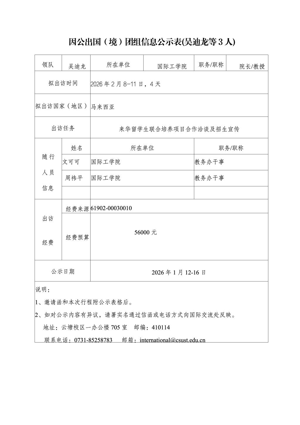 因公出国(境)团组信息公示表(吴迪龙等3人)