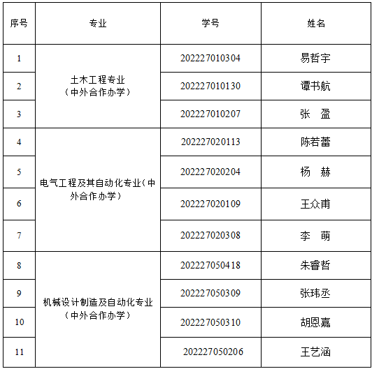 拟推荐土木工程专业(中外合作办学)、电气工程及其自动化专业(中外合作办学)、机械设计制造及其自动化专业(中外合作办学)共11位学生免试攻读2026年普通类计划研究生(见附件1),并将相关材料提交教务处审核。