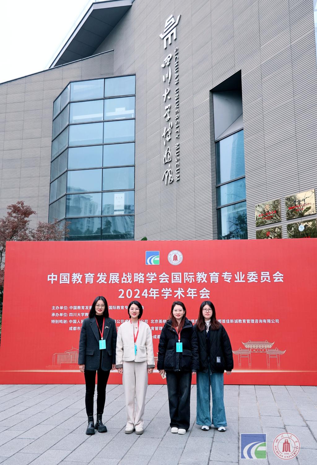 12月19日,中国教育发展战略学会国际教育专业委员会2024年学术年会在四川大学召开。此次会议以“推动高水平教育对外开放,助力全球治理人才培养”为主题,中国教育发展战略学会会长、武汉大学原党委书记韩进,教育部国际合作与交流司二级巡视员吴劲松,四川大学副校长游劲松致辞。欧美同学会副会长、亚洲教育论坛荣誉秘书长姚望,中国国家留学基金管理委员会秘书处副秘书长田露露,上海纽约大学副校长丁树哲,北京师范大学-香港浸会大学联合国际学院党委书记兼副校长毛亚庆等200余名嘉宾及代表参加大会,共同探讨教育对外开放的新趋势、新机遇与新挑战,以及如何通过参与全球教育治理、推进教育创新与改革,进一步提升我国教育的国际影响力、竞争力和话语权。我院4名教师代表罗帅、李稀、周祎平和霍雨珂应邀参加本次年会。