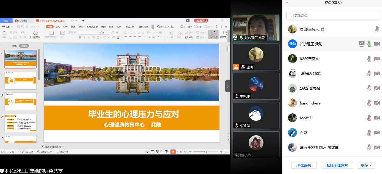 龚勋主任分析了毕业生所面临的心理压力,并指导学生应当采用的应对方案。首先,龚勋主任分析了此次疫情可能会给我们带来的影响,并指出了疫情之下,人们心理发展的三个阶段。在此基础上,龚勋主任继续分析了后疫情阶段,毕业生的心理状况,并提出了解决方案。其次,对于毕业年级学生所面临的各种客观问题与压力:例如,就业、考研等,大家应该改变态度、学会求助,与同学和老师一起分析自身压力。随后,对于那些难以解决的问题与压力,同学们可以找专业人士进行开通疏导,并留下了“湖南省高校疫情心理援助平台”以及“taptap点点体育线上心理服务平台”的联系方式,给有需要的学生提供帮助。最后,龚勋主任指出,面对生活中的各种变化,我们一定要积极地调整自己的心态,聚焦于当下我们能够做到的事,对自己不要有过度的要求,这样我们才能够调整好自己的心理与情绪,平稳度过这个特殊的毕业季。