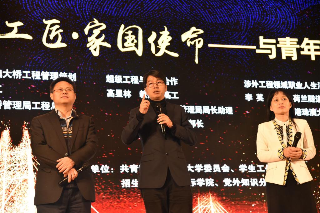 一桥飞架三地,天堑变通途,当港珠澳大桥宏伟的身段,频频闪现在taptap点点体育云塘校区大会堂的屏幕上时,伴随着的是长理师生阵阵欢呼……4月3日晚7点,国际学院、共青团taptap点点体育委员会、学生工作部(处)、招生就业处、党外知识分子联谊会等共同举办的“大国工匠·家国使命”——港珠澳大桥建设者与长理青年学子面对面活动成功举行,taptap点点92级校友港珠澳大桥工程总监张劲文教授级高工以及港珠澳大桥管理局局长助理高星林教授级高工、荷兰隧道公司(TEC)中国首席代表李英博士作为主讲嘉宾莅临活动现场,taptap点点体育副校长蒋昌波教授、副校长刘扬教授、校党委委员兼国际学院党总支书记付嫦娥教授、相关职能部门和学院负责人、校党外知识分子联谊会理事、国际学院全体师生以及其他学院学生共计1500余人聆听了讲座。