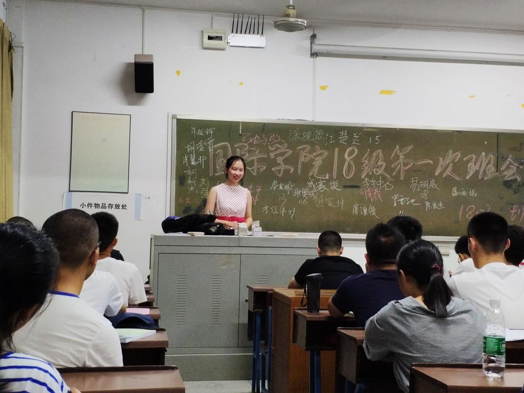 9月9日晚7点,国际学院2018级新生分别在金盆岭校区12教510和511教室召开新生第一次班会。各班班主任、下班党员和下班干部以及全体新生参加了此次班会。学院高度重视新生工作,由校党委委员、学院党总支书记付嫦娥、副书记吴振华担任新生班级班主任。