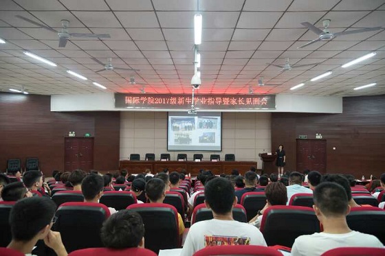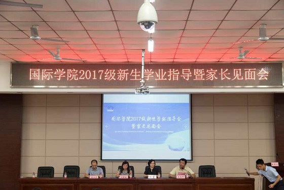 9月10日下午6点整,夜幕降临,文科楼A200科技报告厅里灯火通明,100名新生和他们的家长们倾耳拭目,国际学院2017级新生学业指导会暨家长见面会在此隆重举行。校党委委员、国际学院党委书记付嫦娥,国际学院院长陈瑜,副书记吴振华,院长助理秦卫星,中外合作办学项目办公室、留学生工作办公室、学习发展中心全体老师,2017级全体新生及家长代表出席本次活动。活动由院党委副书记吴振华主持。