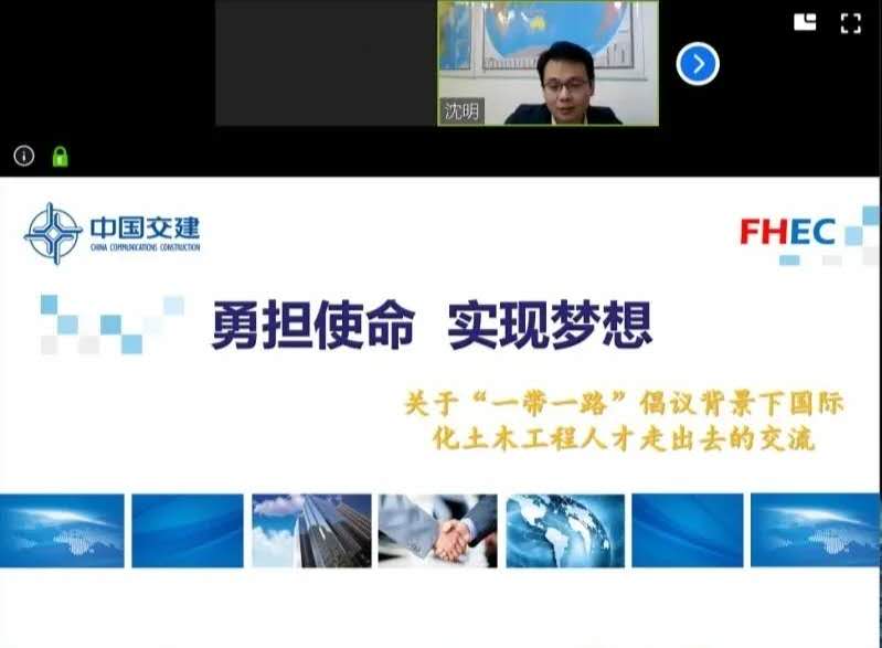 沈明以“勇担使命,实现梦想——关于“一带一路”倡议背景下国际化土木工程人才走出去的交流”为题,从为什么“走出去”、怎样“走出去”、“走出去”需要什么样的人才三方面讲述了我国海外土木工程项目发展现状和趋势,大型企业对国际化土木工程专业人才的需求,并对在校土木工程专业大学生的学习提出建议,叮嘱同学们在疫情防控期间不要放松学习,珍惜学习时光。最后,他还在线耐心地回答了同学们的提问,与同学们进行了深入的交流与互动。
