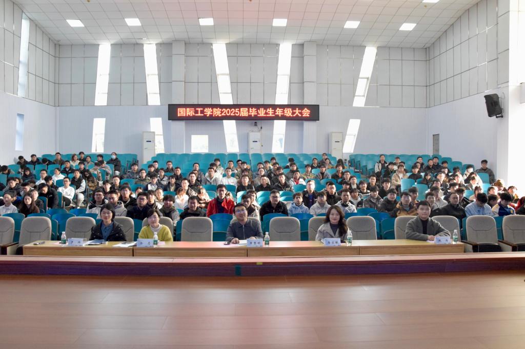 新学期展现新作为,毕业季圆梦绘新图。2月27日下午,国际工学院于学生活动中心科技报告厅召开2025届毕业生年级大会,学院党委副书记兼副院长黄黎明、教务办主任余志、教务办老师罗帅、年级辅导员唐宏敏、魏涛及2025届全体毕业生参会,会议由魏涛主持。
