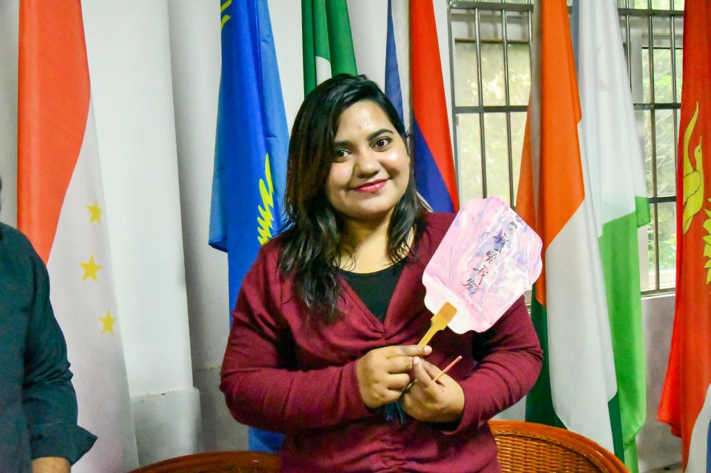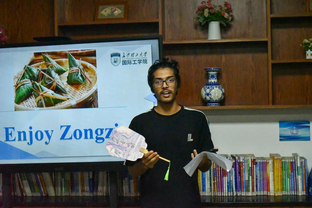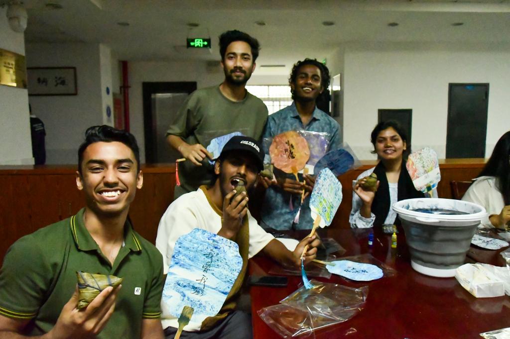 选材、调色、浸染、成型,中外学子全神贯注,精心雕琢漆扇的每一处细节。在作品展示环节,中外学子纷纷上台展示了自己制作的精美漆扇,分享各自创作灵感与心理感悟。来自孟加拉国的留学生沐辰表示:“漆扇制作让我感受到中国文化的细腻与包容,过程中专注的状态也缓解了我的心理压力。”在相互交流中,中国学生也深入了解了多样化的心理调节方式,有效促进了文化互鉴。同时,本次活动还融入端午习俗,以粽香为媒,让中外学子在传统文化氛围中增进情谊。