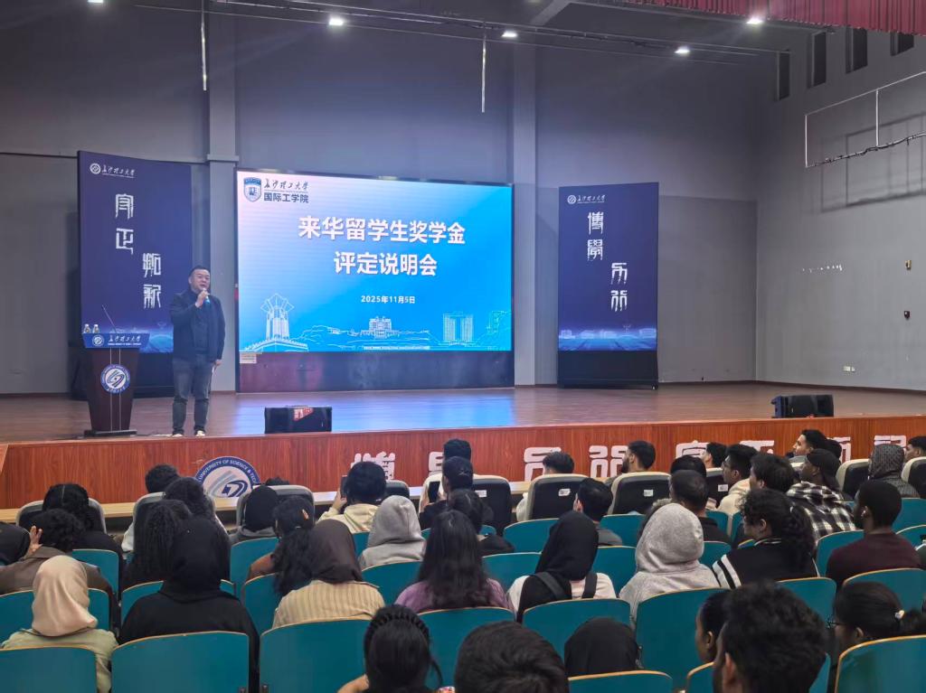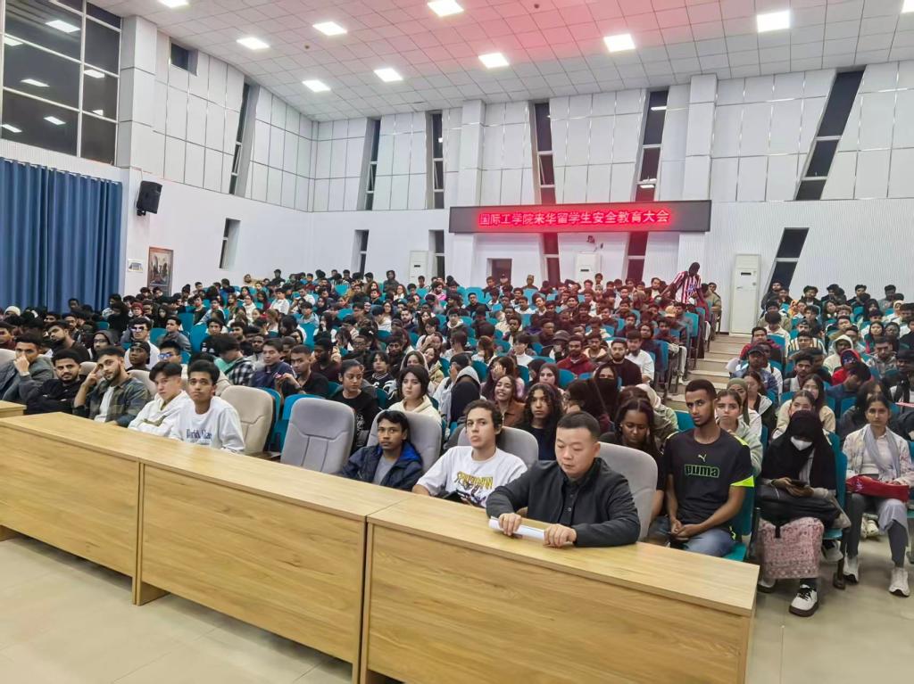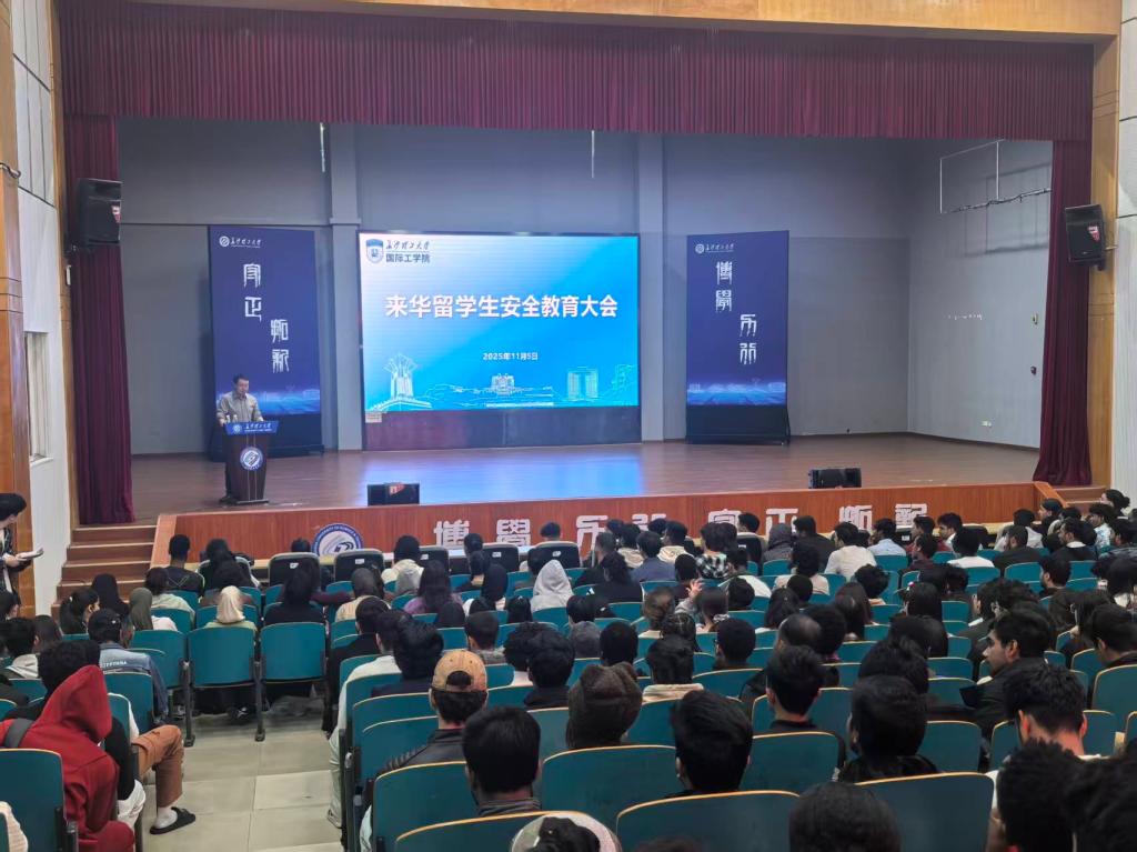 为帮助来华留学生更好适应校园生活,全面增强安全防范意识,明确行为规范与发展路径,国际工学院于2025年11月5日在学活科技报告厅召开全体来华留学生安全教育大会。会议由学院党委副书记兼副院长黄黎明主持,留学生辅导员及全体留学生参会。