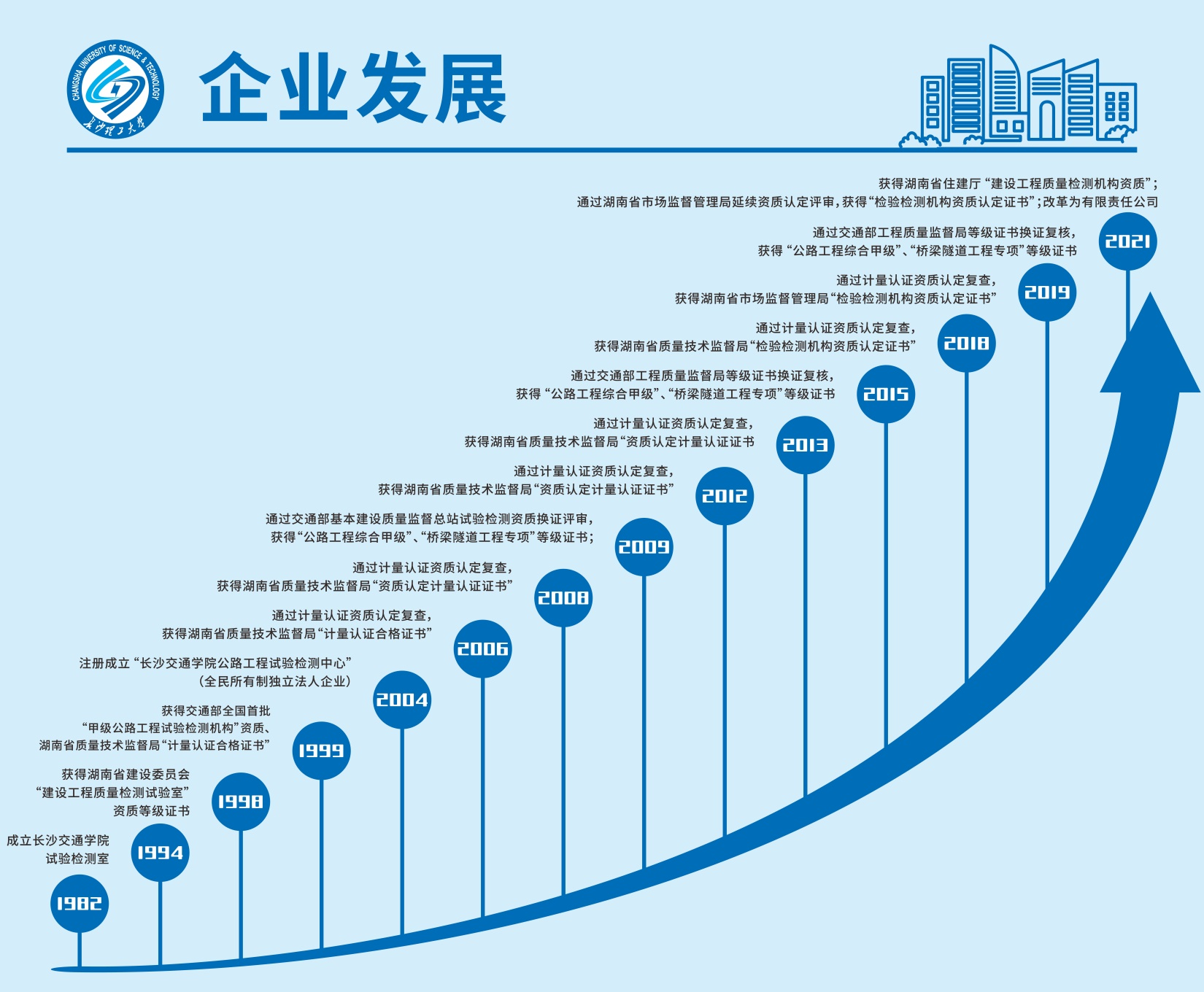 通过多年的建设和发展,公司取得了湖南省市场监督管理局颁发的检验检测机构资质认定证书(CMA),现有交通运输部颁发的“公路工程综合甲级”、“公路工程桥梁隧道工程专项”试验检测机构等级证书,住建部颁发的“公路行业(公路)专业乙级设计资质”,湖南省住建厅颁发的“建设工程质量检测机构资质”(钢结构工程检测、主体结构工程现场检测、地基基础工程检测和见证取样检测)。通过了ISO9001质量管理体系、ISO45001职业健康安全管理体系和ISO14001环境管理体系认证。是湖南省高新技术企业,中国交通建设监理协会试验检测工作委员会理事单位、湖南省检验检测学会理事单位、湖南省交通建设工程试验检测协会副理事长单位、湖南省交通建设质量安全学会理事单位、湖南省建设工程质量安全协会会员单位、长沙市房屋安全鉴定协会理事单位。