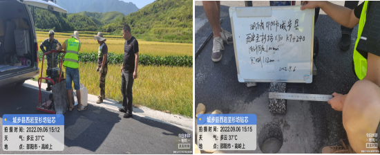 志愿帮扶小组根据农村公路质量检测服务有关要求,结合现场实际施工情况,开展了路面厚度、标线厚度、波形梁板基底金属厚度、立柱埋深和标志基础尺寸等检测。