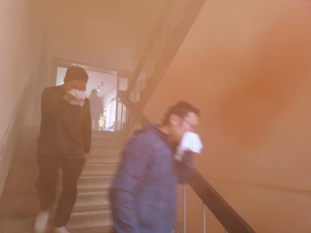 在逃生疏散演练时,随着烟雾弹喷出的股股浓烟,安全员拉响了消防警报,并大声呼喊“着火啦,大家尽快撤离  ……  ”,员工们按照培训时学习的逃生方式,迅速用湿毛巾或衣袖捂住口鼻,弯腰低姿有序沿着消防通道、消防楼梯快速地撤离了“着火”的办公大楼,抵达安全区域。安全员在组织大家紧急疏散的同时,按照发生火灾的应急处置预案,第一时间“拨打”了119电话报警,并向学校保卫部报告。