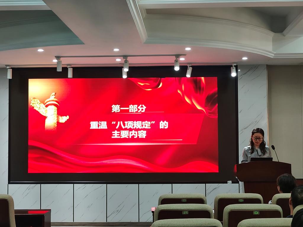 文丽丽书记首先带领全体党员重温中央八项规定的主要内容,结合高校工作实际,详细阐述了改进工作作风、密切联系群众、厉行勤俭节约等方面的具体要求。随后,活动围绕违反中央八项规定精神的主要表现展开剖析,通过典型案例警示党员警惕“四风”问题新表现,特别是违规收受礼品礼金、公款吃喝、变相旅游等易发问题。文丽丽书记特别指出,高校是立德树人的主阵地,教师党员要时刻保持清醒头脑,坚决抵制享乐主义、奢靡之风,将纪律意识转化为教书育人的内在动力。最后,全体党员共同学习了《中国共产党纪律处分条例》中关于违反八项规定的相关党纪条规,重点解读了违反规定行为的处分依据与量纪标准。