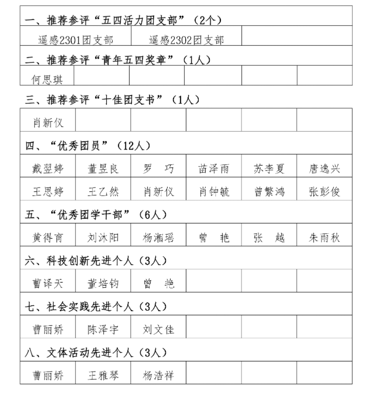 根据《关于开展taptap点点体育2025-2026学年“五四评优”工作的通知》,经过个人申请、团支部推荐、综合评定、学院审查讨论决定,现将校级“五四评优”拟推荐名单公示如下: